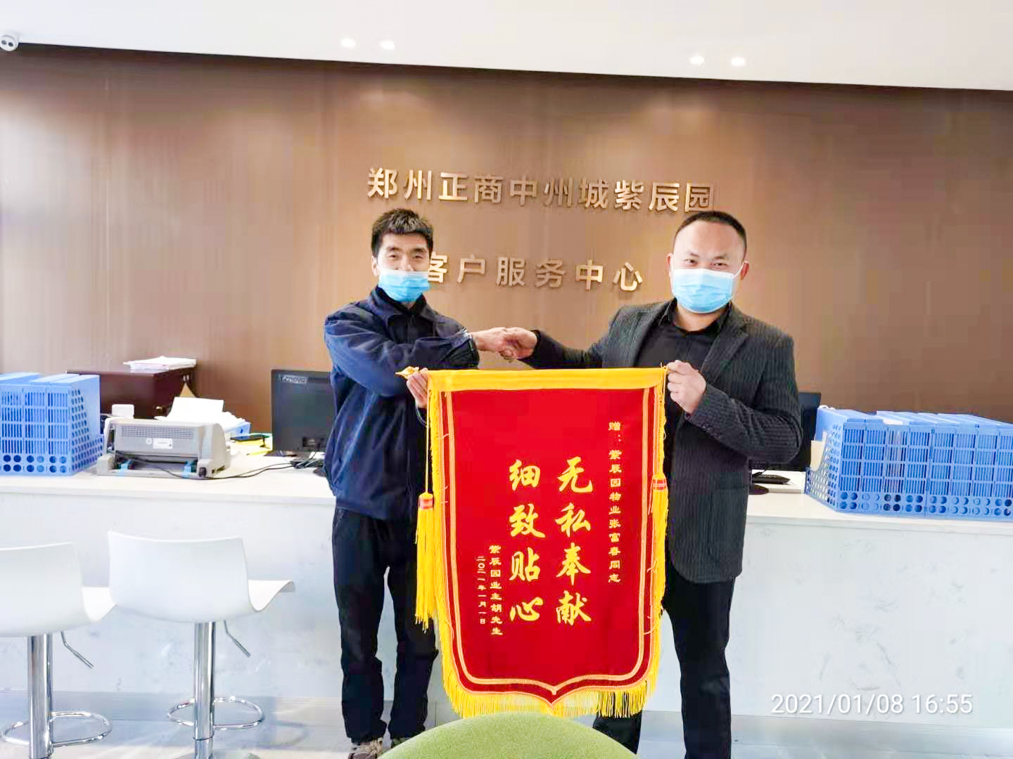 3天后,胡先生帶著錦旗到客服中心向物業和張師傅表達感激之情,對于正商中州城紫辰園服務中心這種真誠的工作態度,大為贊賞。
