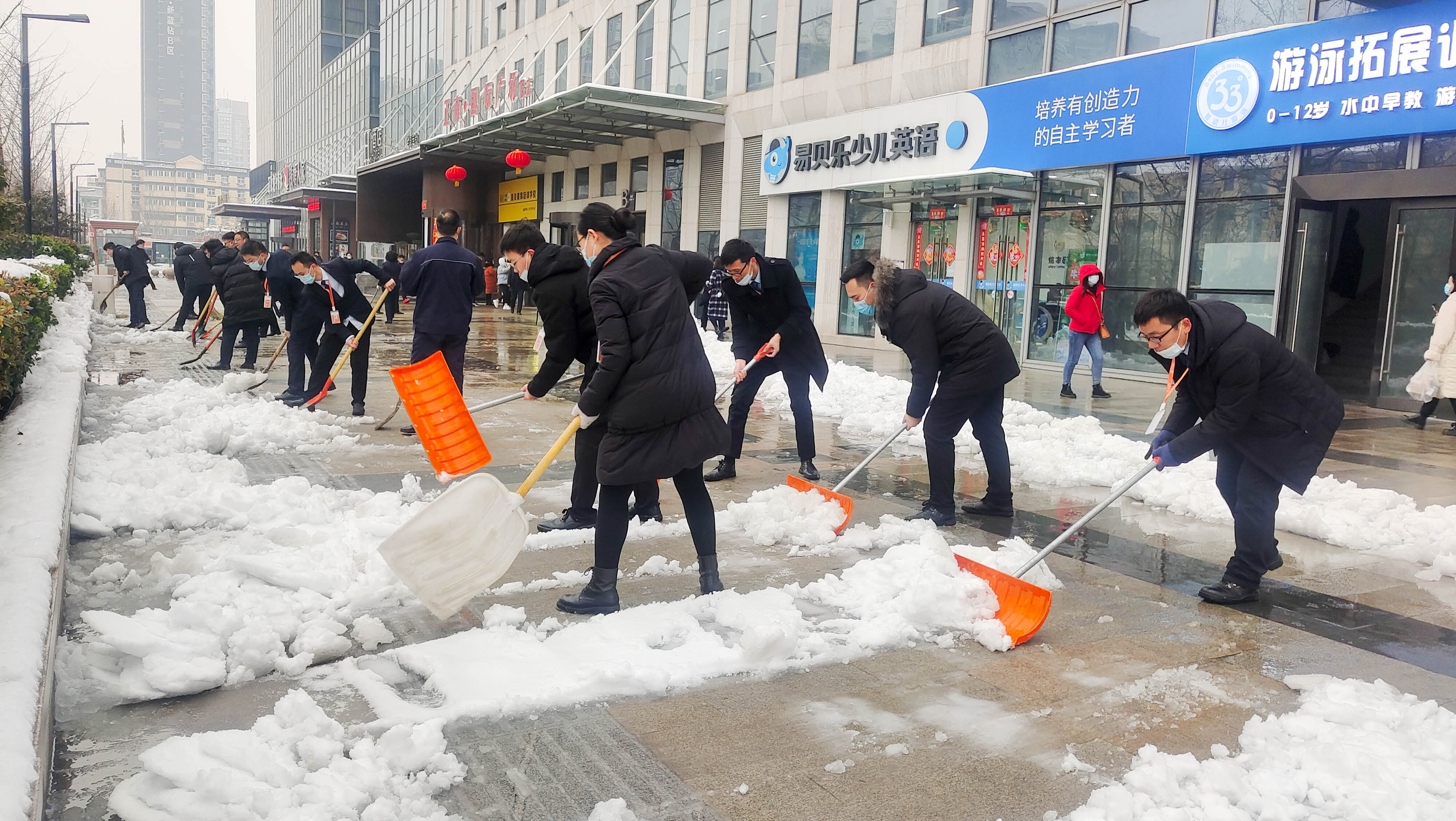 一場皚皚白雪,一群雪中的物業人。他們的背影成為寫字樓廣場一道靚麗的風景線。