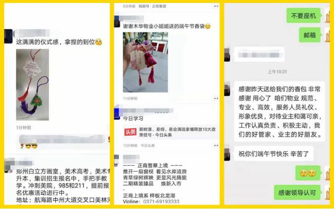 正商四大銘筑,興業物聯的工作人員更是帶著美好的祝福,將一顆顆香囊,裝飾在客戶的門前、送到客戶手中。