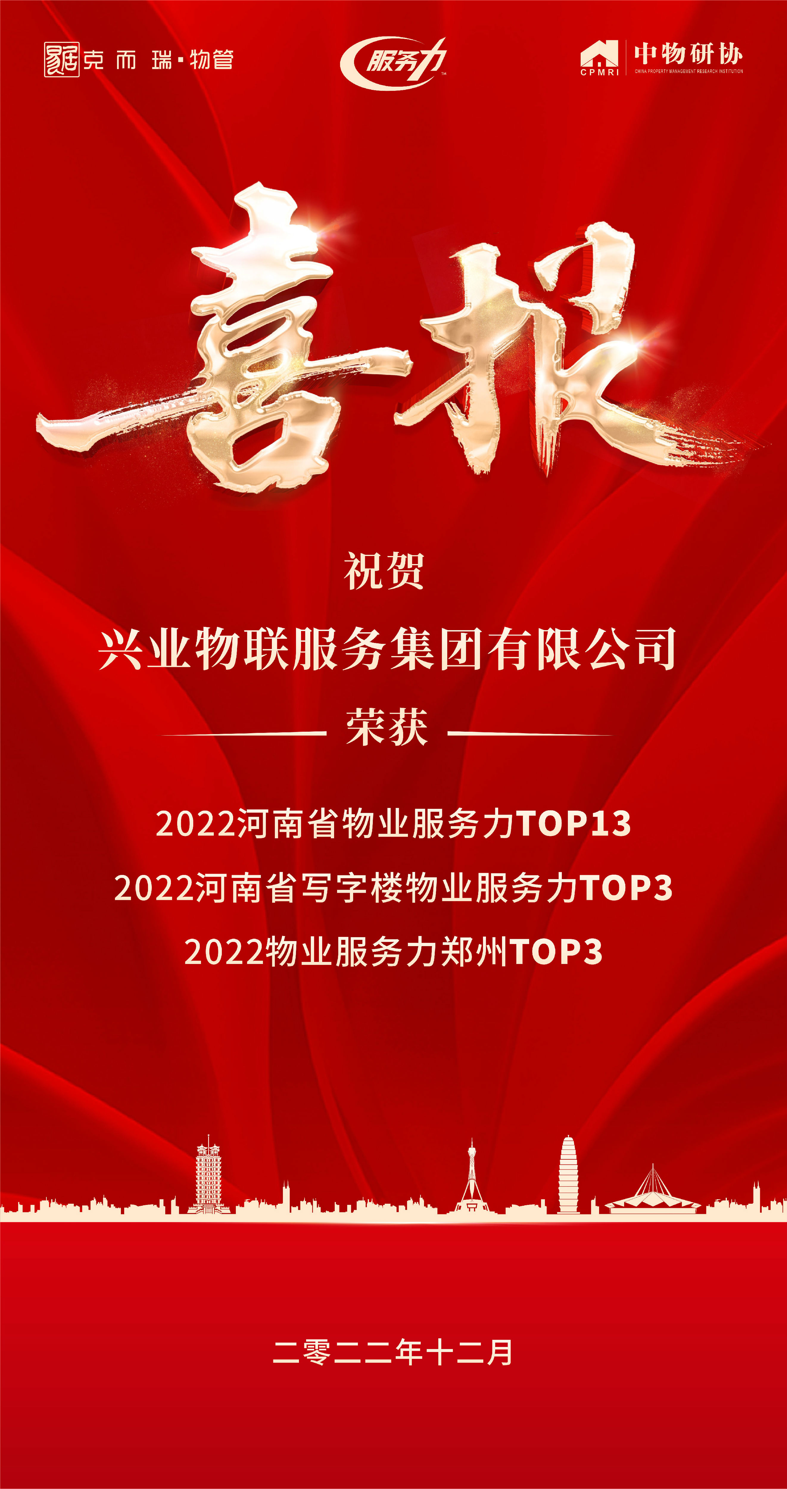 興業物聯憑借憑借企穩向好的綜合實力,專業的服務能力以及品牌創新能力榮獲“2022河南省物業服務力企業TOP13”、“2022鄭州物業服務力企業TOP3”、“2022河南省寫字樓物業服務力TOP3”。